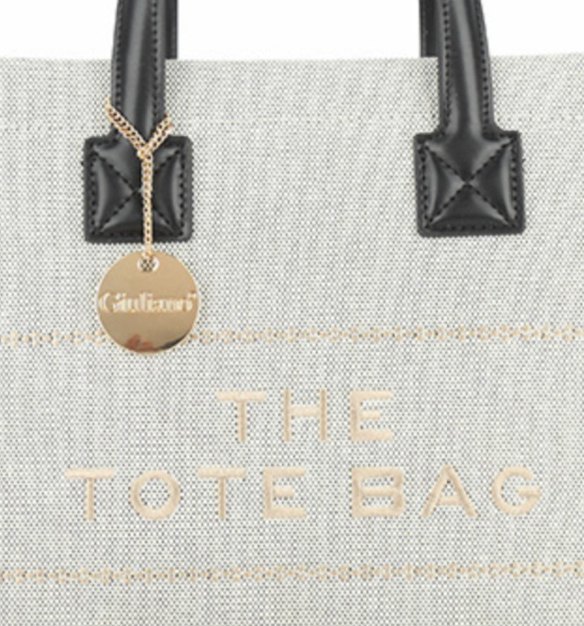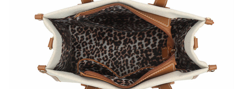 The Tote Bag, prachtige tas van kunstleer in het beige, zand met zwart. Met afneembare schouderband en de binnenkant is afwerkt met een tijgerprintje.